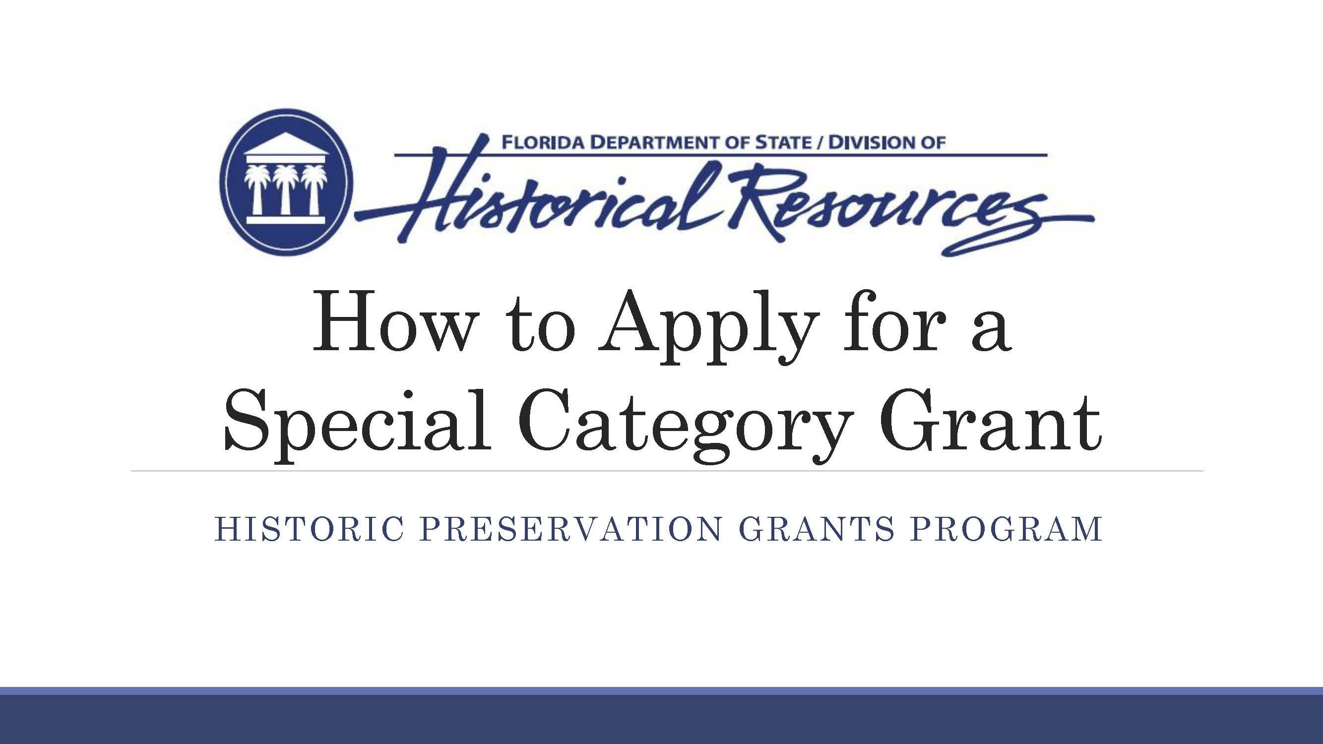 The Department of State, Division of Historical Resources, provides state funds for historic preservation. The purpose of this program is to provide funding to assist major local, regional and state-wide efforts to preserve significant historic and archaeological resources, to assist major archaeological excavations or research projects, and assist in the development and fabrication of major museum exhibits that will promote knowledge and appreciation of the history of Florida. The program does not fund operational support for historic preservation organizations. This program provides historic preservation grants on a competitive basis. The Legislature determines the amount appropriated annually for the program, and funding for all eligible applications is not guaranteed. The Special Category Guidelines specify program policies and procedures.